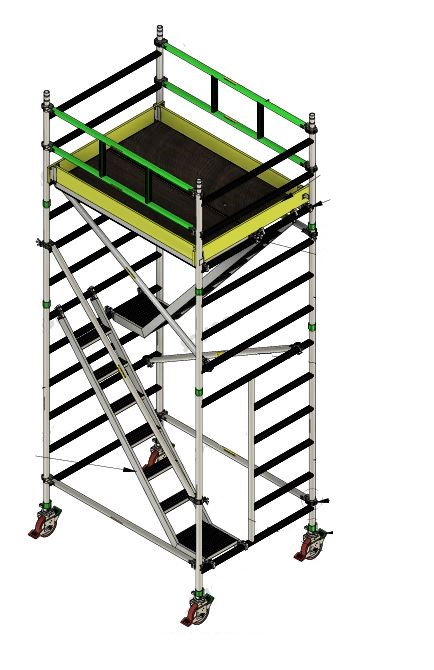 It has a spacious platform with a Safe Working Load of approx. 250 kg, it supports up to 3 people working simultaneously. It consists a stair ladder with handrail and extra base jack support for wind stability on heights 15 m and above.